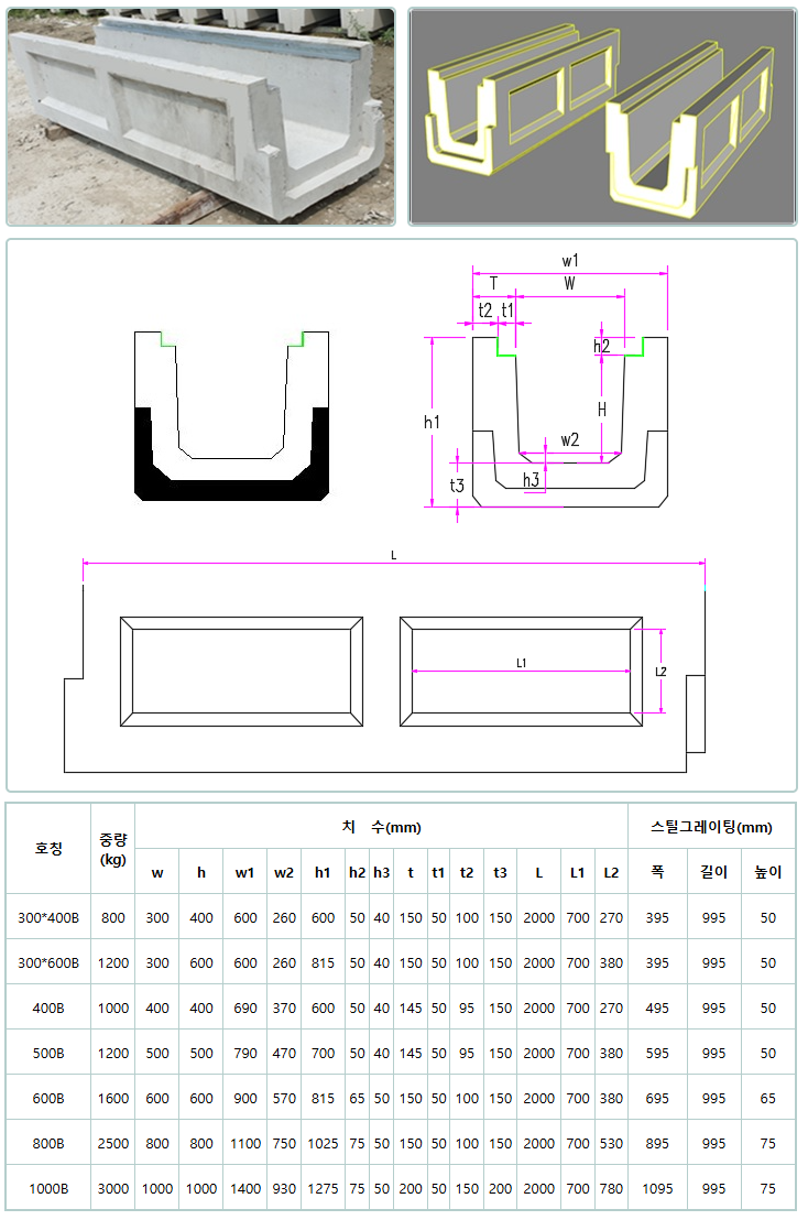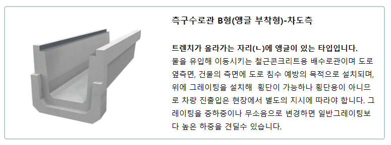 측구수로관 B형(앵글 부착) : 300*400B, 400B, 500B, 600B, 800B, 1000B