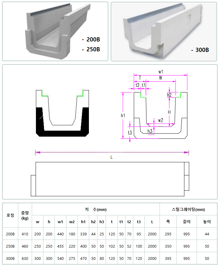 측구수로관 B형(앵글 부착) : 200B, 250B, 300B